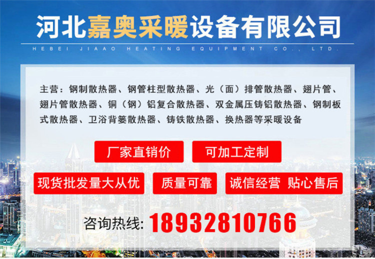 我公司主营产品有钢制柱型散热器,光排管散热器,翅片管散热器,温室大棚、工业蒸汽、厂房车间、养殖水暖散热器,铜(钢)铝复合散热器,双金属压