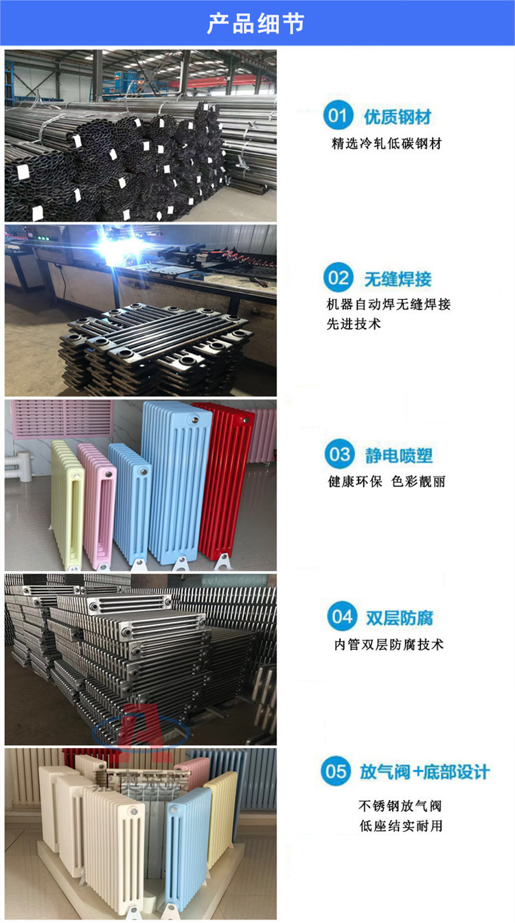 钢制柱型散热器以钢管为原料,具有重量轻、金属强度高、耐压能力强、安装维修方便、散热快,能耗小,外形美观,样式多、颜色多等特点.