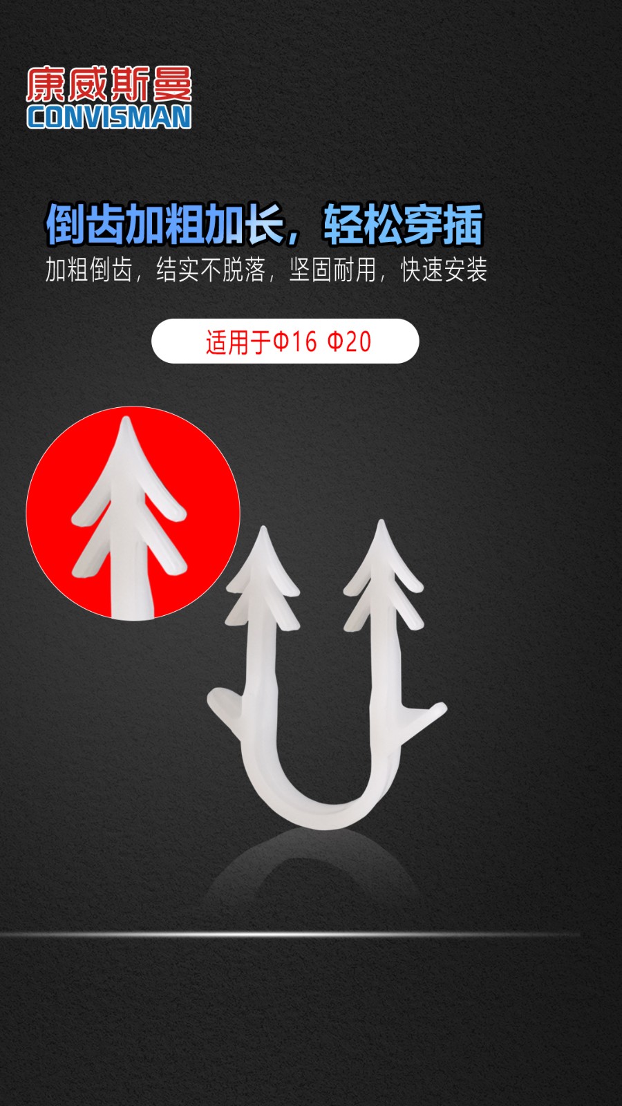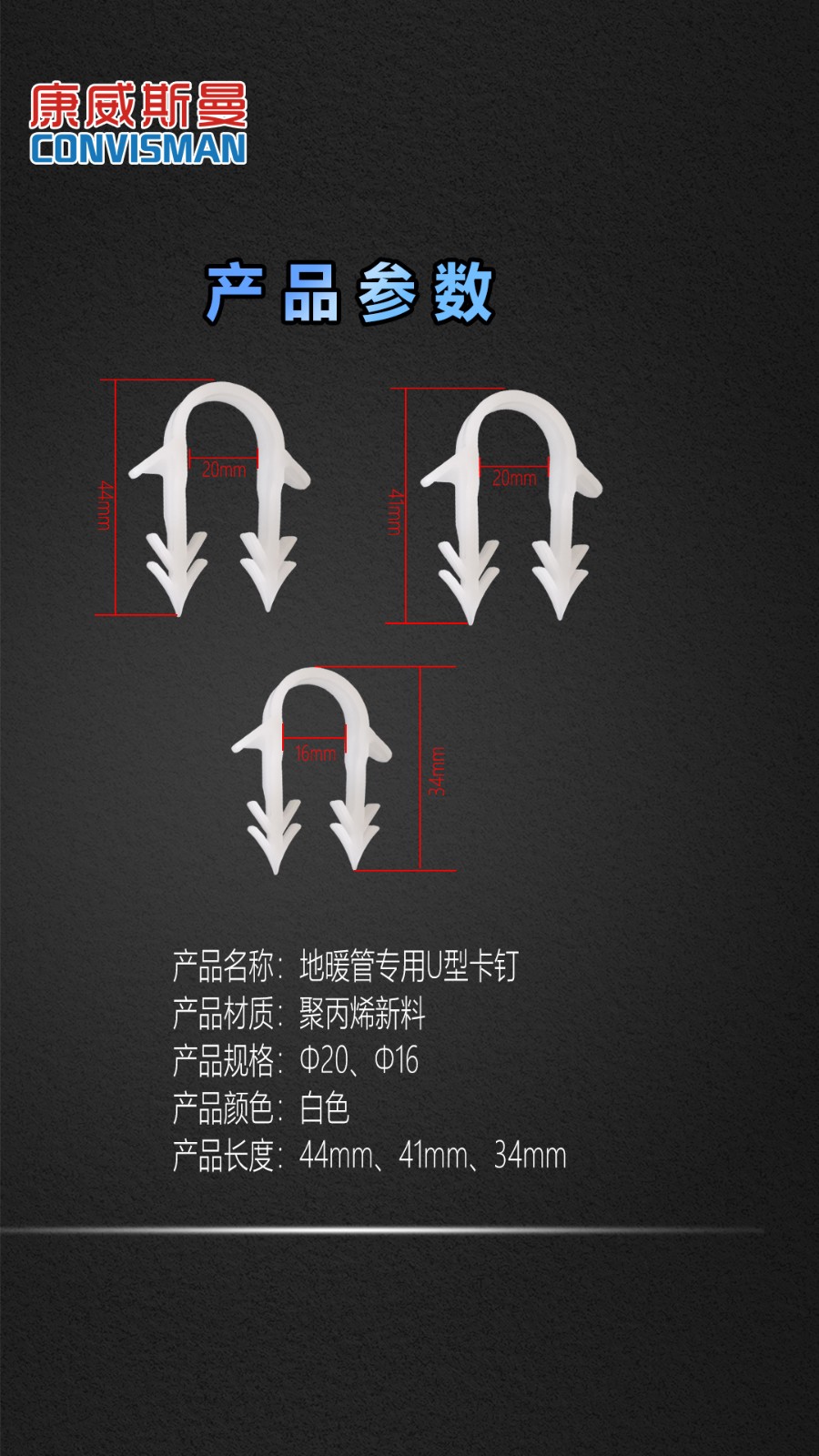 康威斯曼地暖管U型环保勾钉:严选新料,不掺杂料,食品级环保,硬度高; 加粗倒齿,结实不脱落,坚固耐用,快速安装。