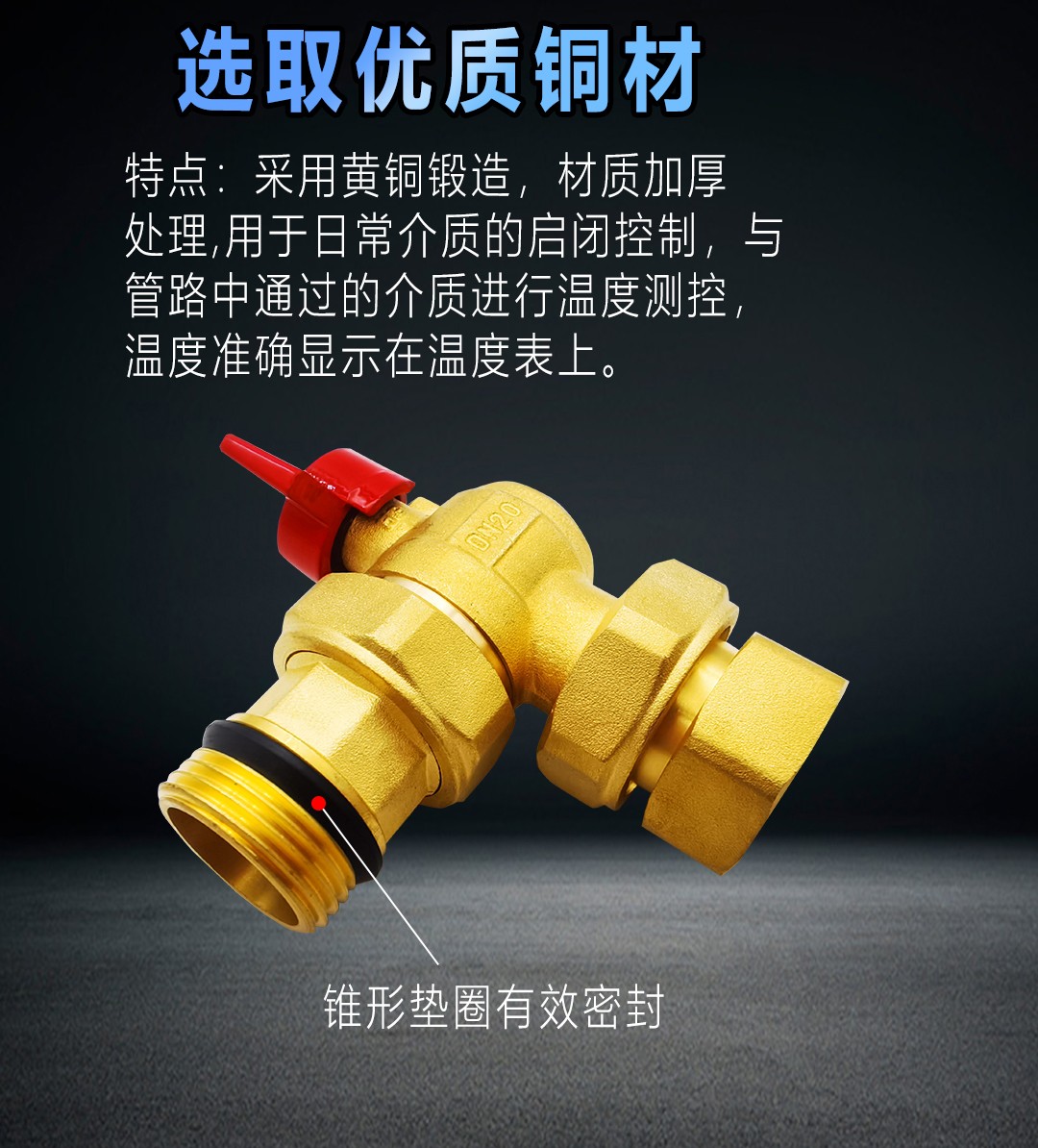 康威斯曼1寸内外丝活接角阀:采用黄铜锻造,材质加厚处理,用于日常介质的启闭控制,与管路中通过的介质进行温度测控,温度准确显示在温度表上。