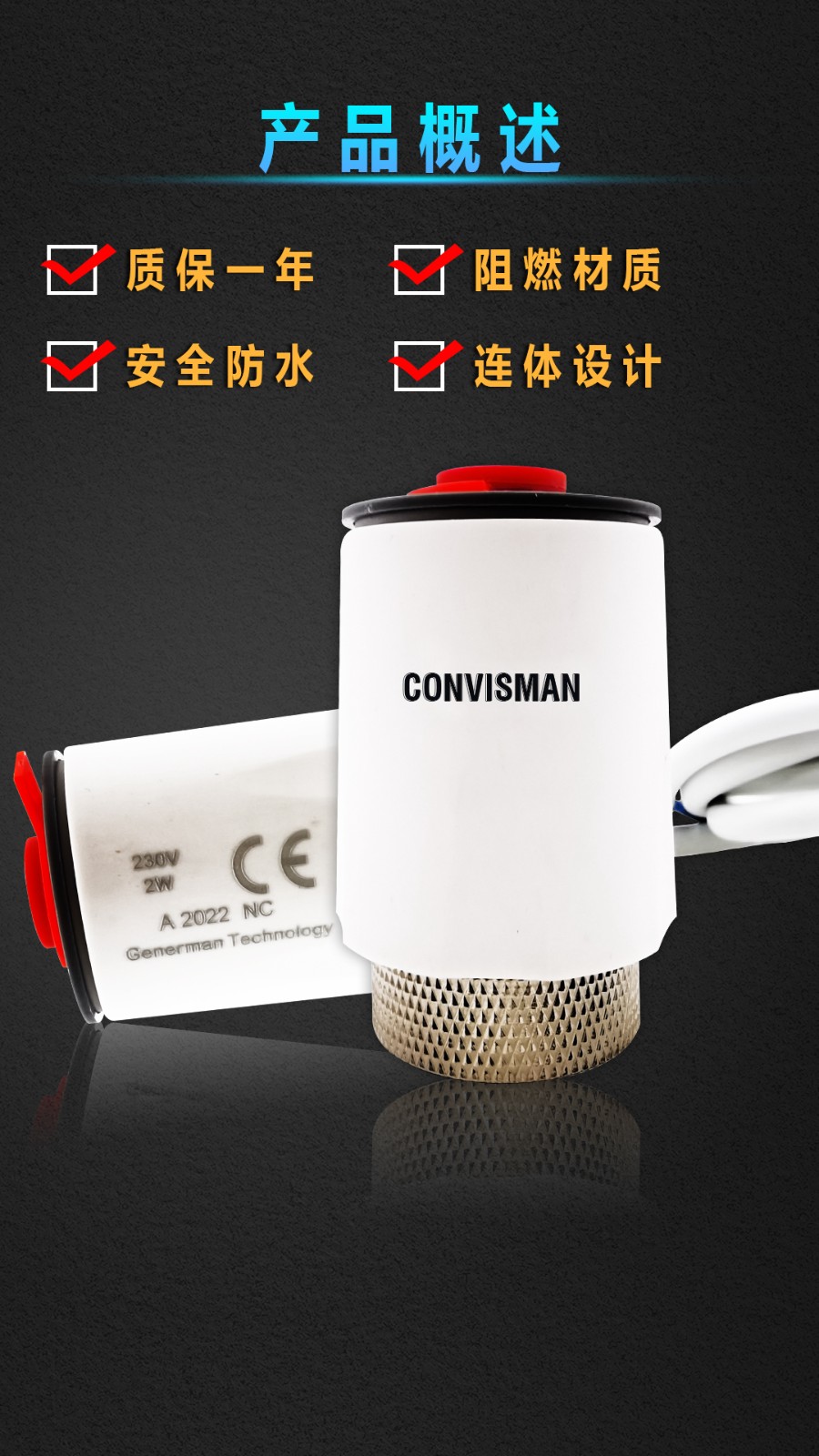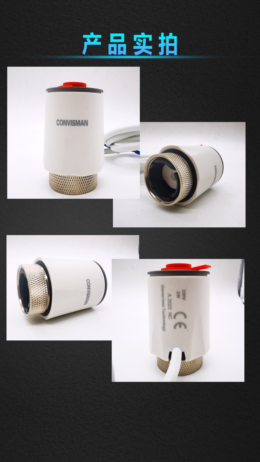 康威斯曼电热执行器:性能特点: 1.电热执行器体积小,重量轻节能、环保(采用弹簧自动复位省电、用热膨胀原理工作无嗓音),安装与拆卸方便快捷,主要用于地暖分水器,中央空调(水系统)、小型阀门的开启与关闭。常闭型执行器通电后阀门将自动打开,常开型 通电后阀门将自动关闭,用户在选购时必须明确执行器的类型后再购买。 技术参数: 工作电压:230V/AC50/60Hz 功耗:3VA 工作温度:最大60℃ 连接方式:螺母(M30x1.5)