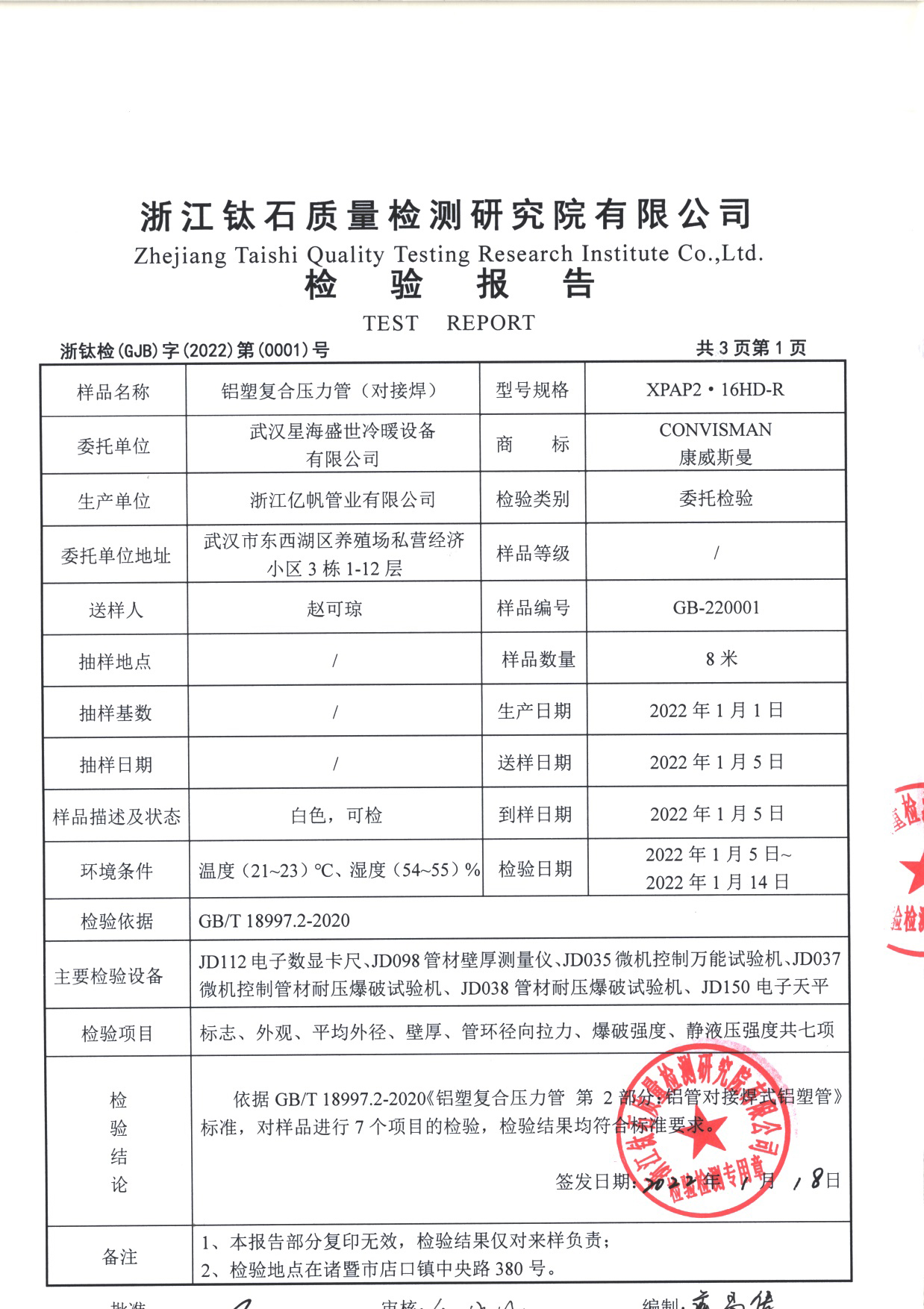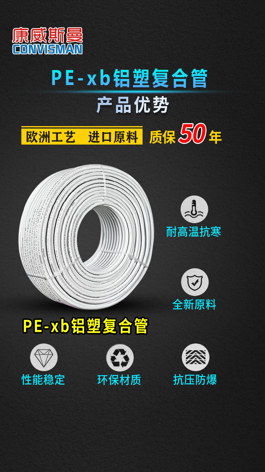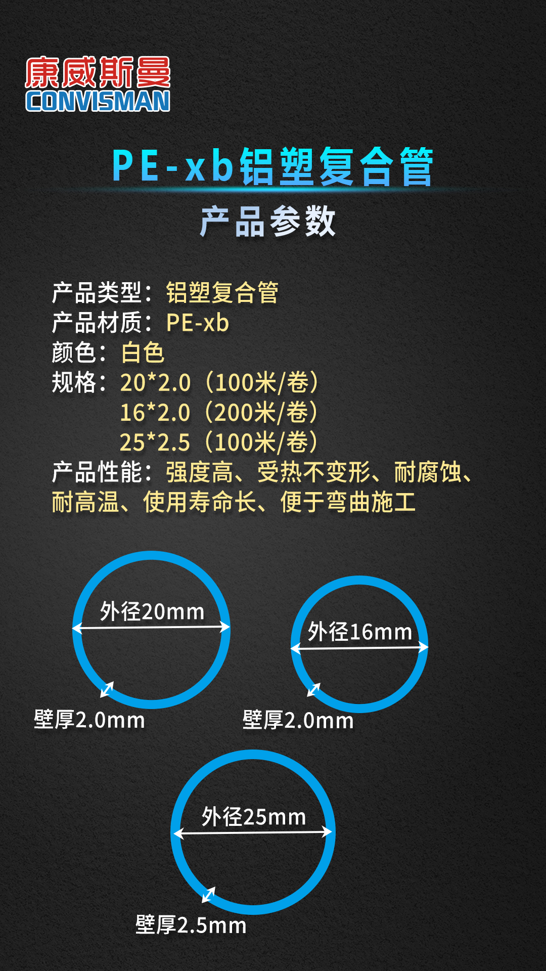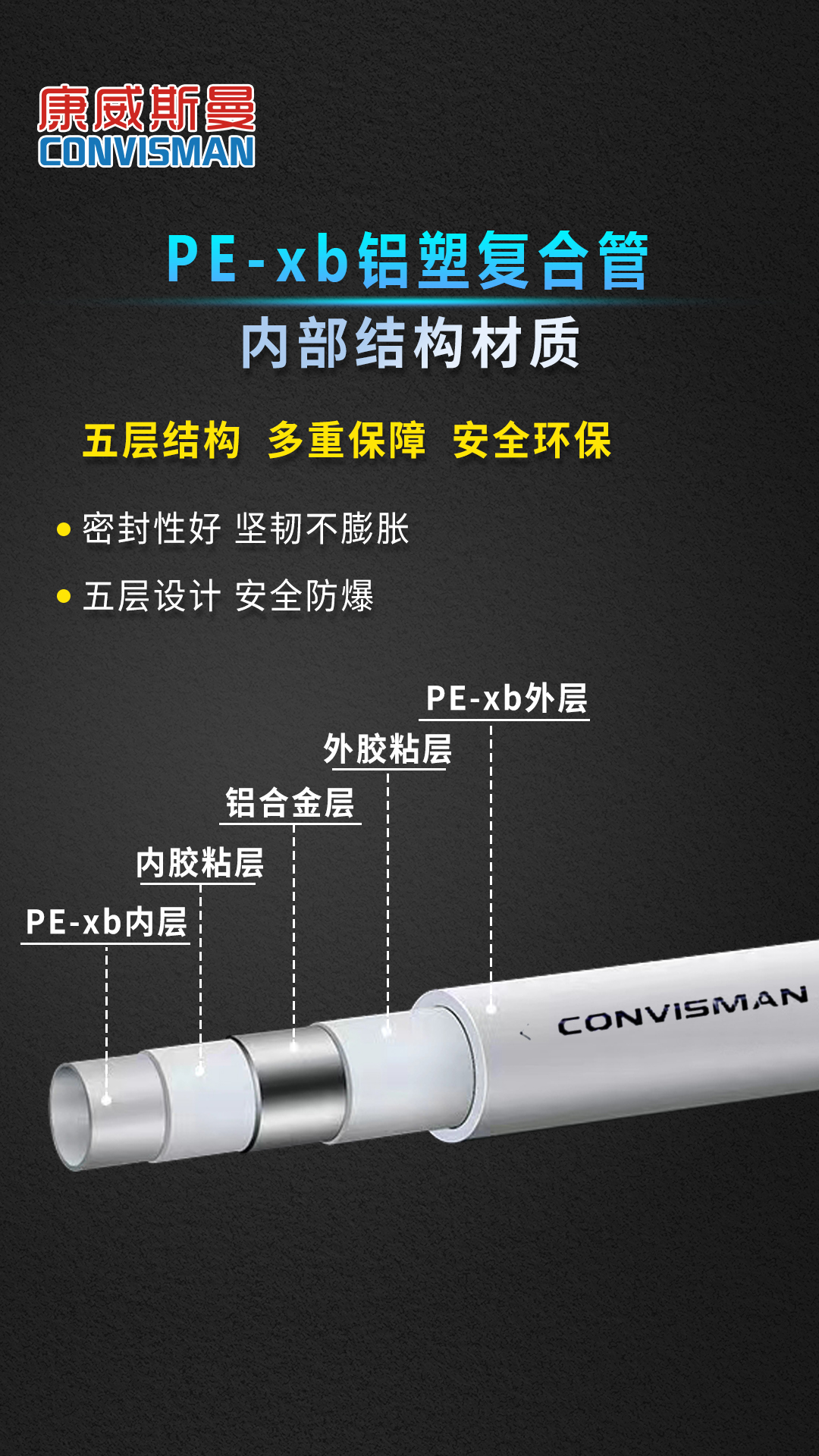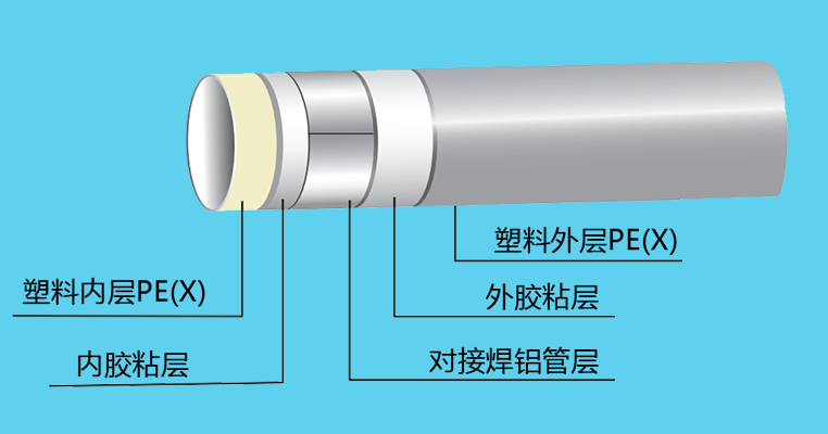 康威斯曼PE-XB铝塑复合管:卫生无毒,无添加任何有毒物质,符合欧盟卫生标准。 2.能承受PH值在1-14之间的酸和碱的腐蚀,耐高压高温,阻燃。 3.内壁光滑,不积水垢,流量同比增加30% 4.保温节能,导热系数仅为金属管的1/200,用于热水管道保温节能效果极佳 5.铝层夹层,膨胀系数小,韧性好 6.重量轻,为金属管道的1/7,易于切割加工 7.热熔连接,安装简单,使用寿命长,在规定使用条件下寿命长达50年 8.采用铝层夹层,可确保氧气不入内,易弯曲,伸直,不反弹 9.对接焊使用温度可达90℃ ,工作压力为1.25Mpa,搭接焊使用温度为82℃ ,工作压力为0.86Mpa。