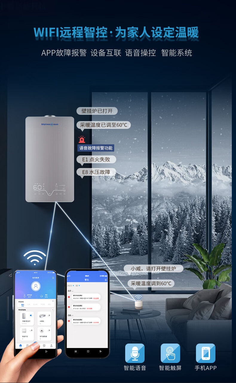水星系列语音智能款燃气壁挂炉24KW:国产智能壁挂炉,手机APP控制,语音对话,语音报错,分段燃烧,司服热水,气候补偿,大数据后台,远程售后,远程维修,热水稳定