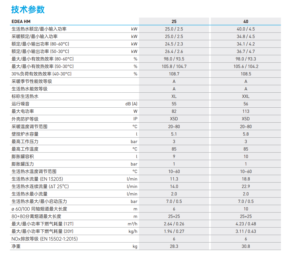 斯密冷凝式燃气采暖热水炉:EDEA HM具有高达 1:10的功率调节比。这意味着,EDEA HM系列的输出功 率可以从最小 2.3kW/h到 36.7kW/h连续工作。减少了壁挂炉启停次数,从而提高了整个供暖系统的高效率,减少能耗损失。EDEA HM 配备了先进的能源管 理系统,实现壁挂炉与热泵的混 合系统按最佳热效率的模式工 作。壁挂式多能源混合系统模 块包含 15L缓冲水箱,不仅可与 EDEA HM 系列壁挂炉、热泵组 合成混合能源系统。且可安装在 壁挂炉后面从而最大程度的节省 安装空间,降低安装难度。锅炉回水温度越低,越能充分吸收烟气中的热 量,冷凝壁挂炉的热效率越高,所以适合于低 温辐射采暖系统。 随着供热时间的延长,壁挂炉的供回水温差逐 渐变小,回水温度逐渐变高,当回水温度超过 烟气中水蒸气的露点温度后,热效率会降低。 EDEA HM 中的变频循环水泵,在保证水流量 的基础上,加大了供回水的温差,使回水温度 始终低于烟气中水蒸气的露点温度,保证壁挂 炉无论在任何环境中,都能保持在冷凝工作范 围内,使得热效率维持在最高的状态。