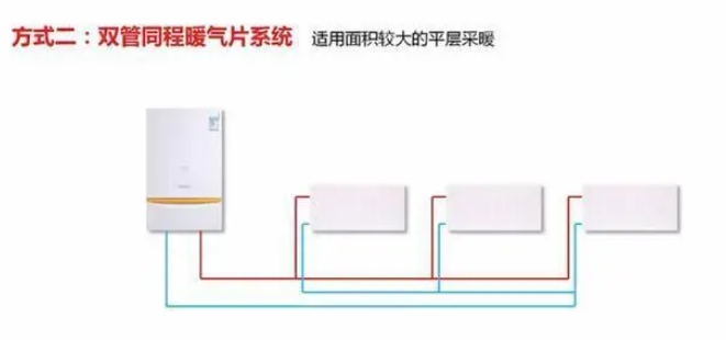 双管同程系统:相比较与双管异程系统,双管同程系统采暖水流过每组散热器的管道长度均相等。虽然在系统安装时会增加一条管道的造价,但不需要安装其它的平衡设备。当系统可以组成一个闭合环路时,就可以省去第三条管路。